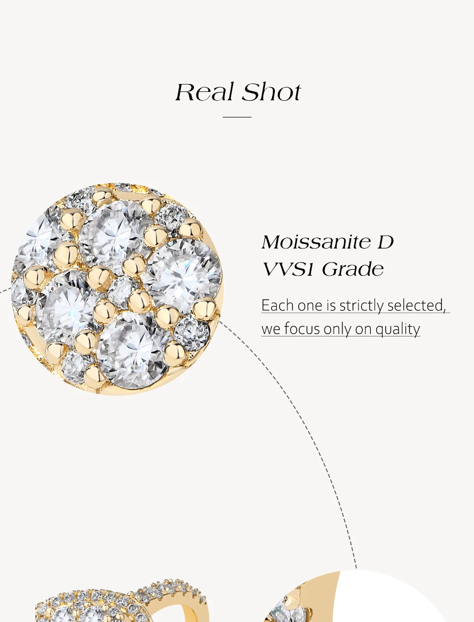 Main stone: 1.3-3.0mm Round D VVS1 Moissanite